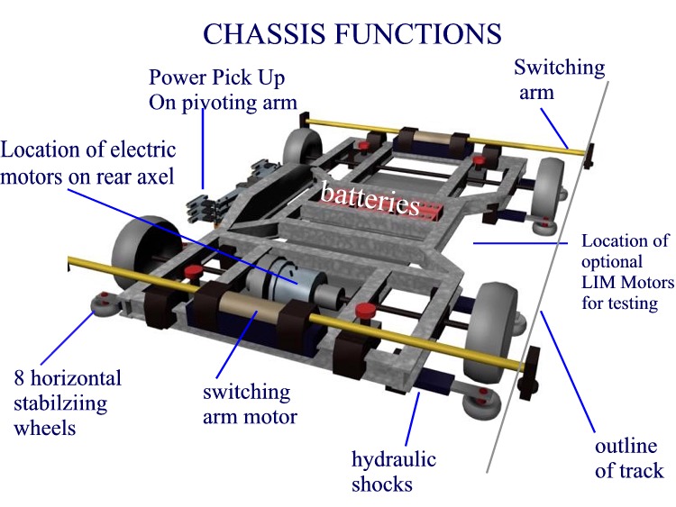 showing how rubber tire vehicle rides on track. The Chassis uses horizontal guide wheels to keep the vehicles between the