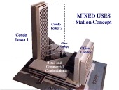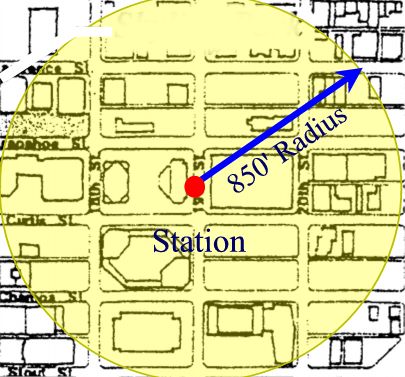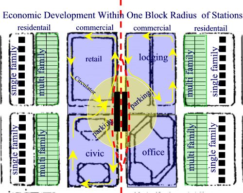 A typical station can serve mixed land uses within a 2 block radius (850') which encompasses 15 blocks averaging 100,000 square feet each. This represents 1.5 million square feet of buildable land around a station for density with a mix of uses including condos, hotel, retail, offices, restaurant and recreational.