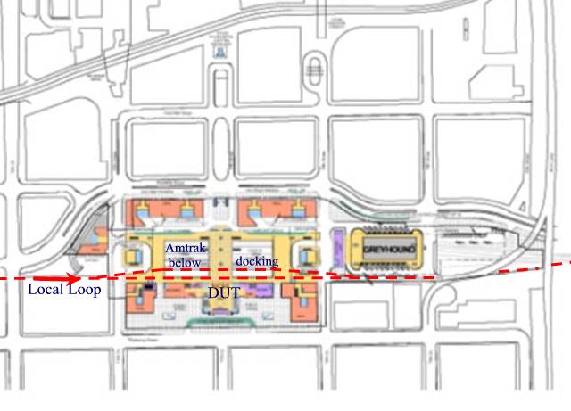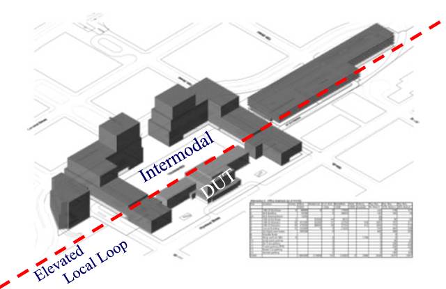 Skyways can fit into the DUT Intermodal by docking above the platform behind DUT Such a platform can be part of the costs of the local route. It could also generate revenues from other venders such as ticket offices and pre-boarding gates for the airport. Retail could be included.